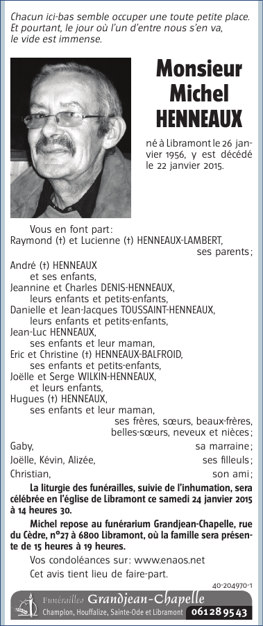 Décédé à Libramont (6800) le jeudi 22 janvier 2015 à l'âge de 58 ans