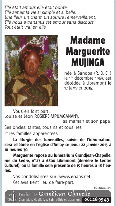Décédée à Libramont (6800) le samedi 17 janvier 2015 à l'âge de 49 ans