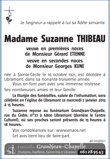 Décédée à Libramont (6800) le samedi 3 janvier 2015 à l'âge de 93 ans