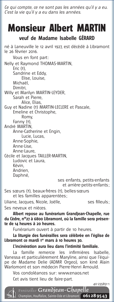 Décédé à Libramont (6800) le vendredi 26 février 2016 à l'âge de 88 ans