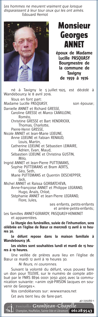 Décédé à Wandebourcy (6662) le vendredi 8 avril 2016 à l'âge de 90 ans