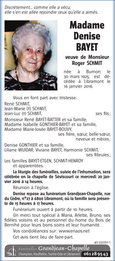 Décédée à Libramont (6800) le samedi 16 janvier 2016 à l'âge de 90 ans