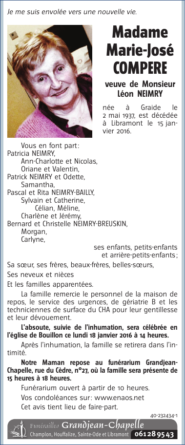 Décédée à Libramont (6800) le vendredi 15 janvier 2016 à l'âge de 78 ans