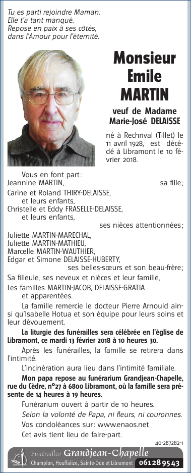 Décédé à Libramont (6800) le samedi 10 février 2018 à l'âge de 89 ans