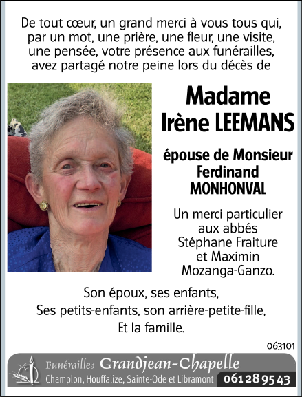 Décédée à Libramont (6800) le samedi 2 décembre 2023 à l'âge de 85 ans