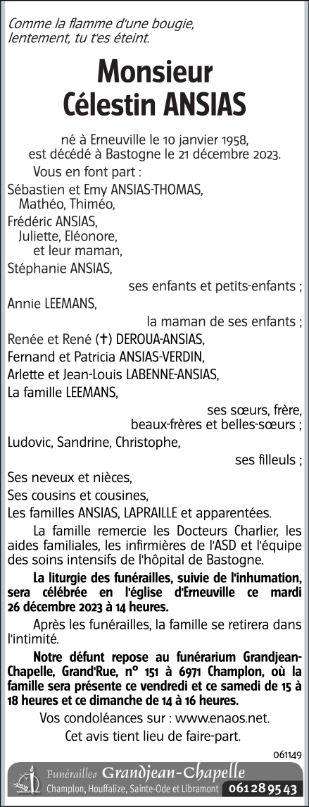 Décédé à Bastogne (6600) le jeudi 21 décembre 2023 à l'âge de 65 ans