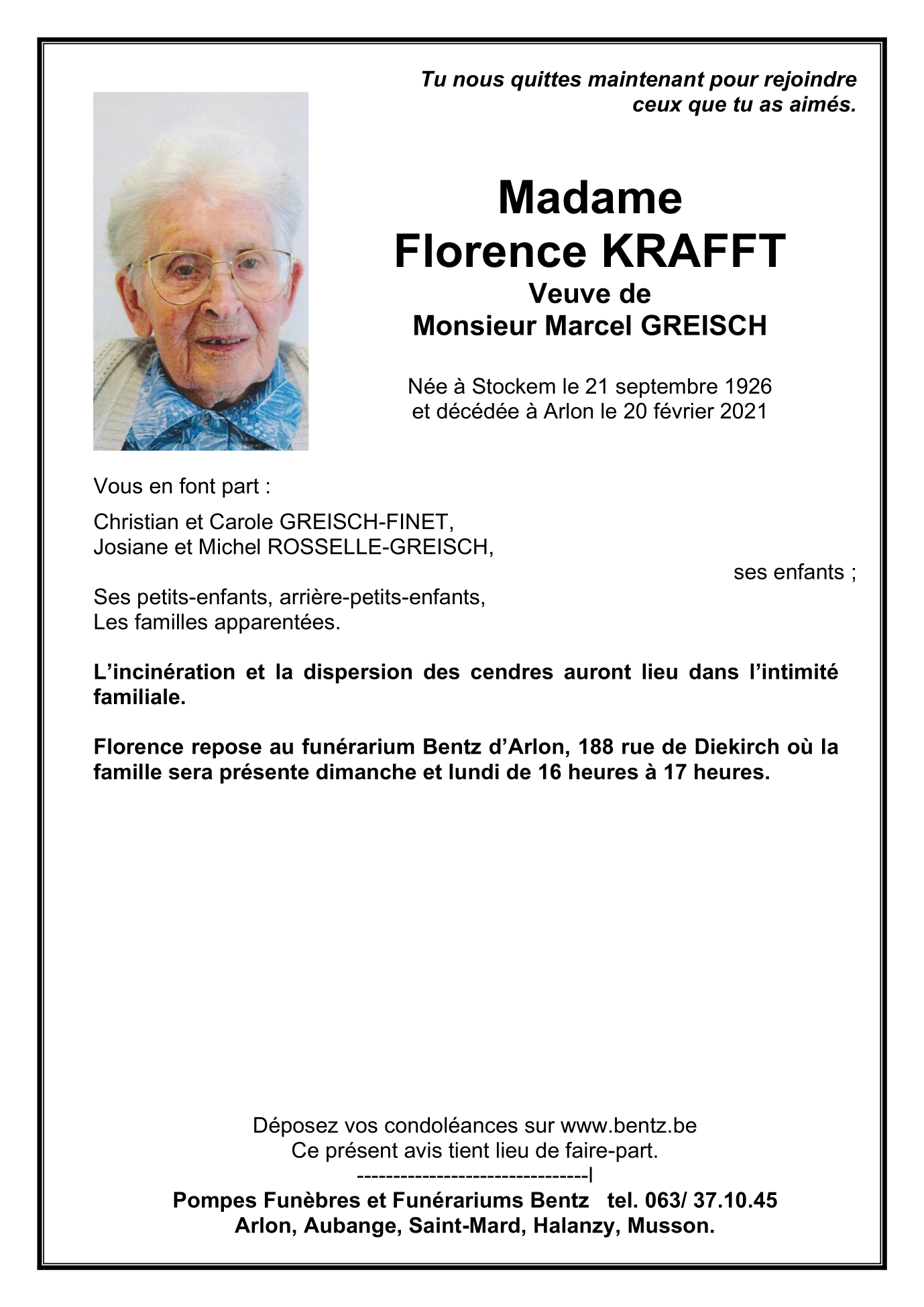 Décédée à Arlon (6700) le samedi 20 février 2021 à l'âge de 94 ans