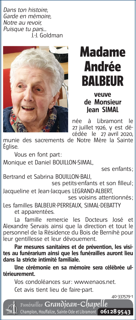 Décédée à Libramont (6800) le lundi 27 avril 2020 à l'âge de 93 ans
