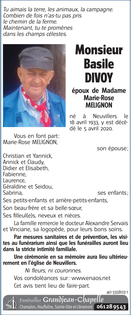 Décédé à Neuvillers (6800) le dimanche 5 avril 2020 à l'âge de 86 ans