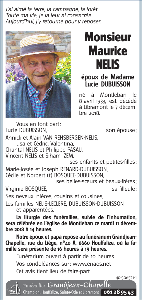 Décédé à Libramont (6800) le vendredi 7 décembre 2018 à l'âge de 85 ans