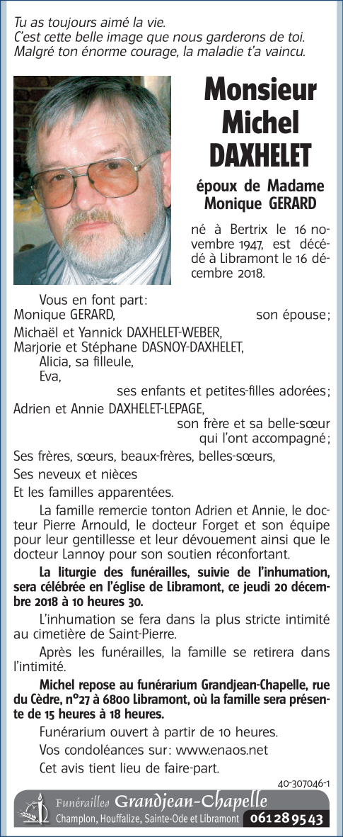 Décédé à Libramont (6800) le dimanche 16 décembre 2018 à l'âge de 71 ans