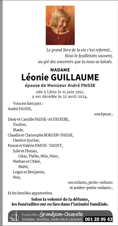 Décédée à Libin (6890) le mercredi 1 mai 2024 à l'âge de 72 ans